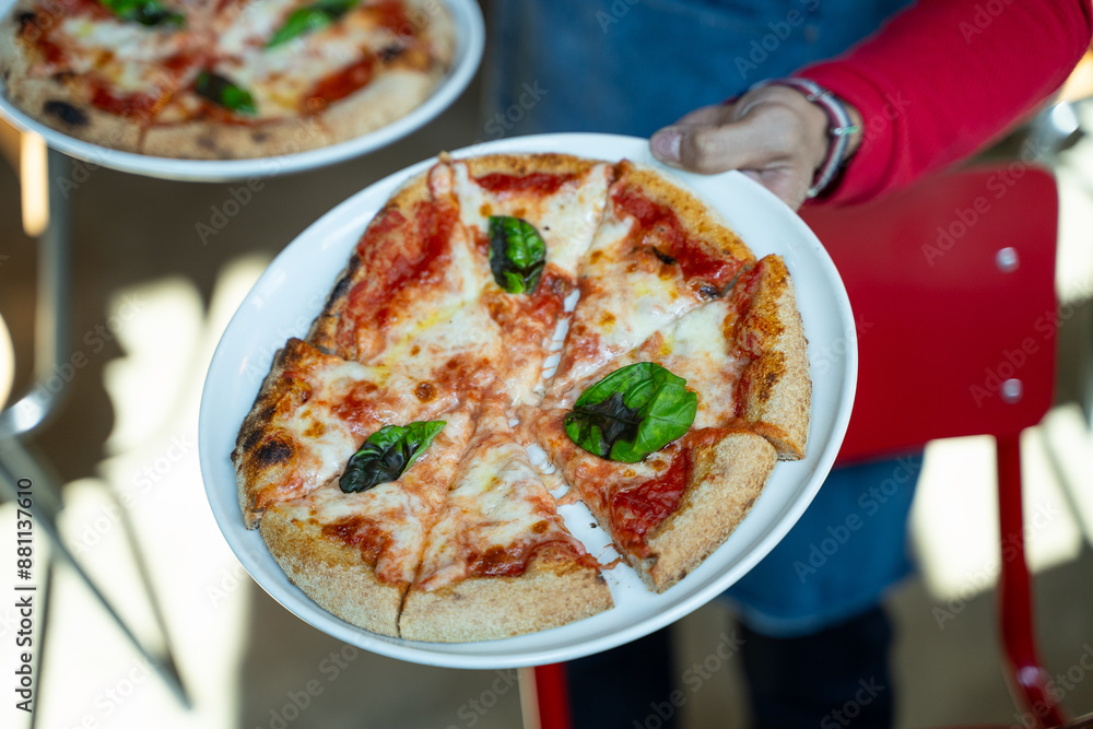 Waiter holding plate with delicious neapolitan pizza margherita with buffalo mozzarella and basil