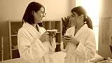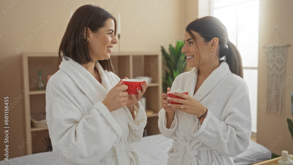 Two women in a spa wearing bathrobes, enjoying a relaxing moment with coffee in a wellness center lounge.