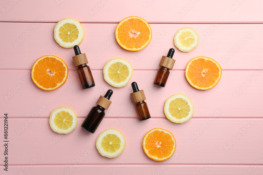 Aromatherapy. Different essential oils and citrus fruits on pink wooden table, flat lay