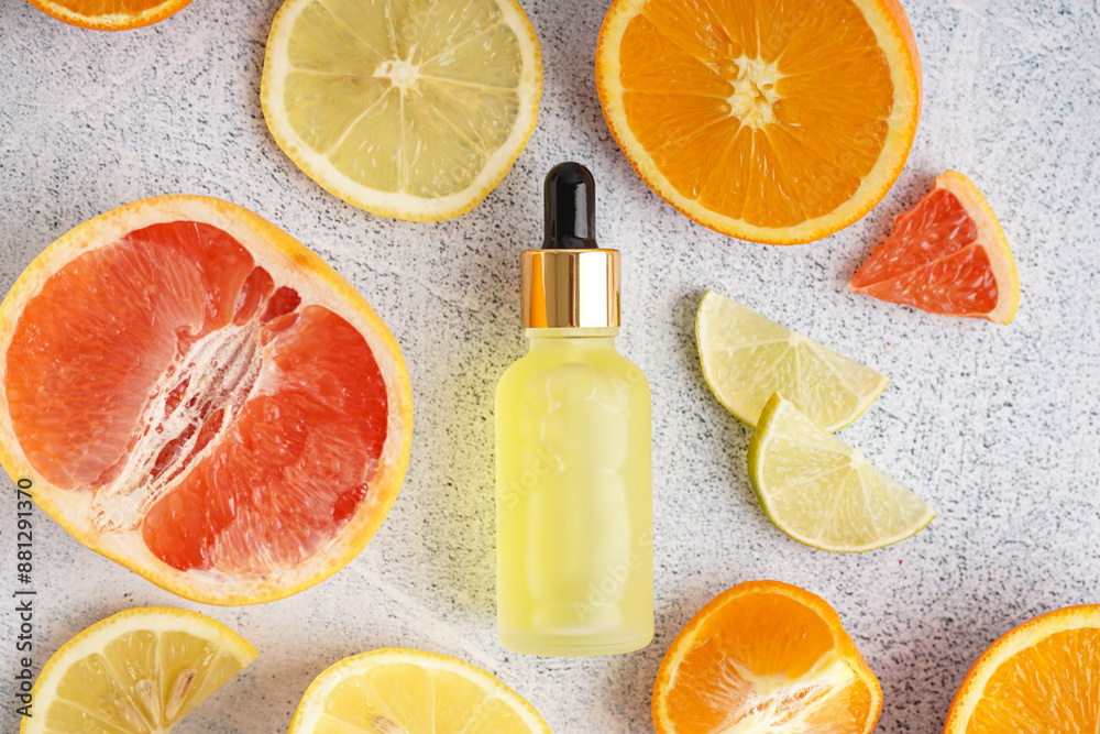 Composition with bottle of essential oil and fresh citrus fruits on light background