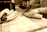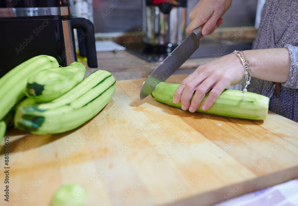 Unrecognizable woman cuts peeled zucchini in Vichy Gross on a wooden cutting board to use as an ingredient in a vegan recipe.