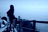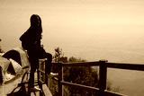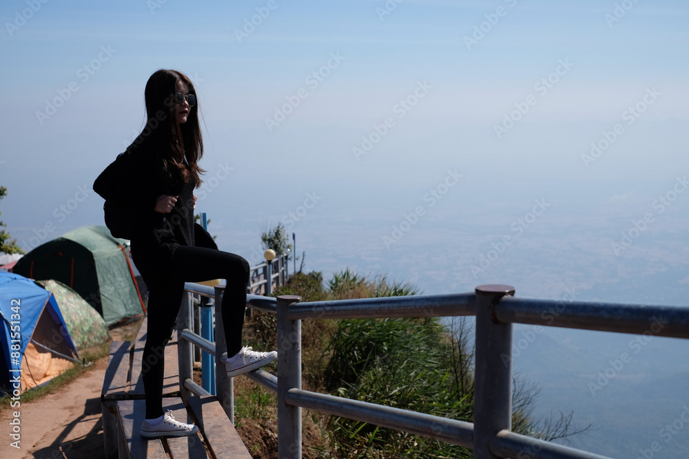 Asian woman in casual sweater of amazing landscape with mountains landscape background.