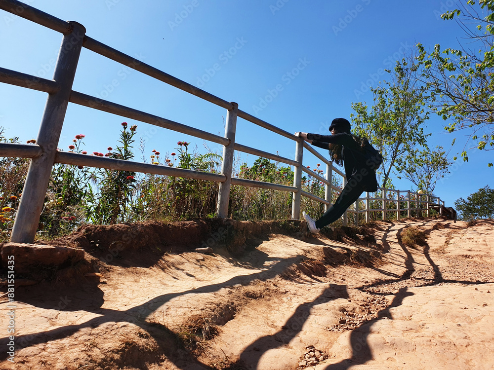 Asian woman of amazing landscape with mountains landscape background. Happy traveler female during vacation in Thailand.