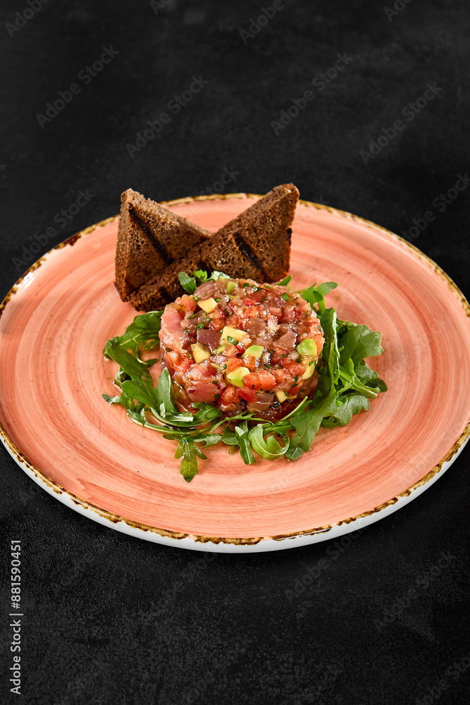 Fresh Tuna Tartare with Avocado on Rustic Plate with Toast Points