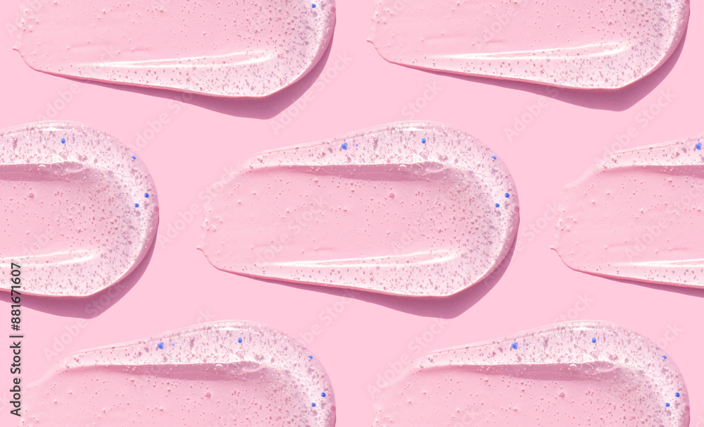 smears round drop of peeling gel test sample of scrub cosmetics on pink background