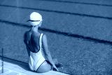 Outdoor swimmer stands by poolside, ready to dive. Sport, recreation, fitness, athlete, swimming pool, active lifestyle