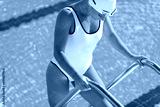 Female swimmer in white swim cap and goggles standing on poolside outdoors, showcasing athleticism, preparation, and outdoor swimming
