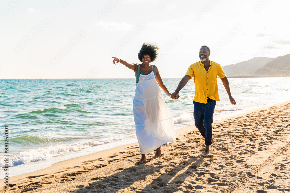 Beautiful mature senior black couple of lovers dating at the seaside - Married african middle-aged couple bonding and having fun outdoors, concepts about relationship, lifestyle and quality of life
