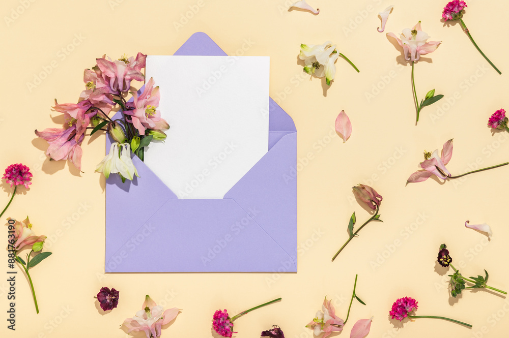 Lilac envelope with pink aquilegia flowers and blank letterhead on a beige background. Postcard layout.