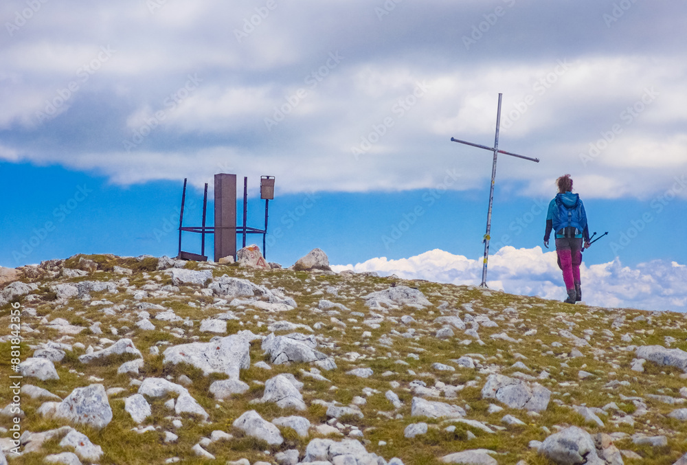 Monte Sirente (Italy) - The landscape summit of Mount Sirente, one of the highest peaks of the Apennines mountain in Abruzzo region, with snow and hiker.