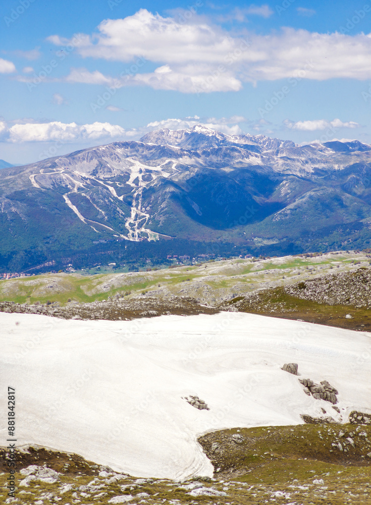 Monte Sirente (Italy) - The landscape summit of Mount Sirente, one of the highest peaks of the Apennines mountain in Abruzzo region, with snow and hiker.