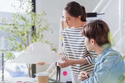 Meeting in a modern architectural office asian architect and interior designer working creative space planing design discuss brainstorm ideas sharing together Architect Team working best solution