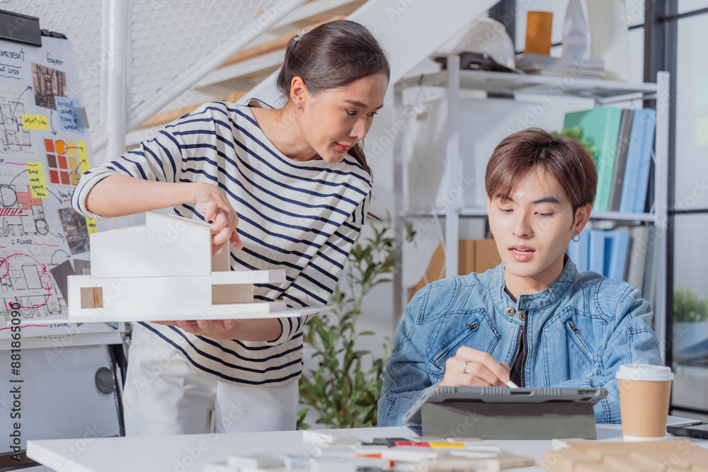 Meeting in a modern architectural office asian architect and interior designer working creative space planing design discuss brainstorm ideas sharing together Architect Team working best solution