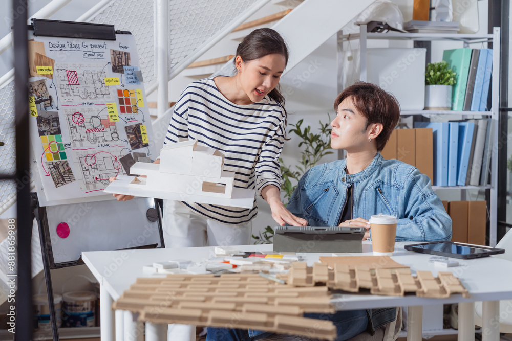 Meeting in a modern architectural office asian architect and interior designer working creative space planing design discuss brainstorm ideas sharing together Architect Team working best solution