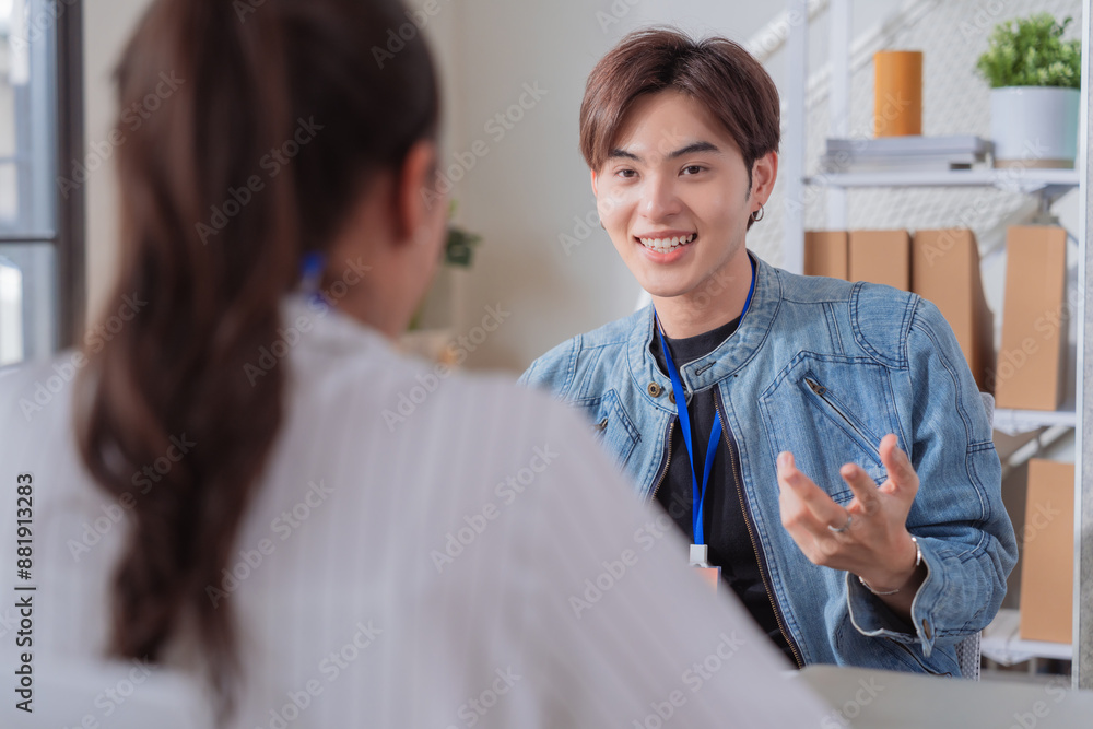 casual good vibe smile laugh conversation brainstorm ideas sharing marketing analysis stretegy talk moment discussion casual cloth Small group of business people working together at the office