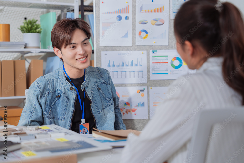 casual good vibe smile laugh conversation brainstorm ideas sharing marketing analysis stretegy talk moment discussion casual cloth Small group of business people working together at the office