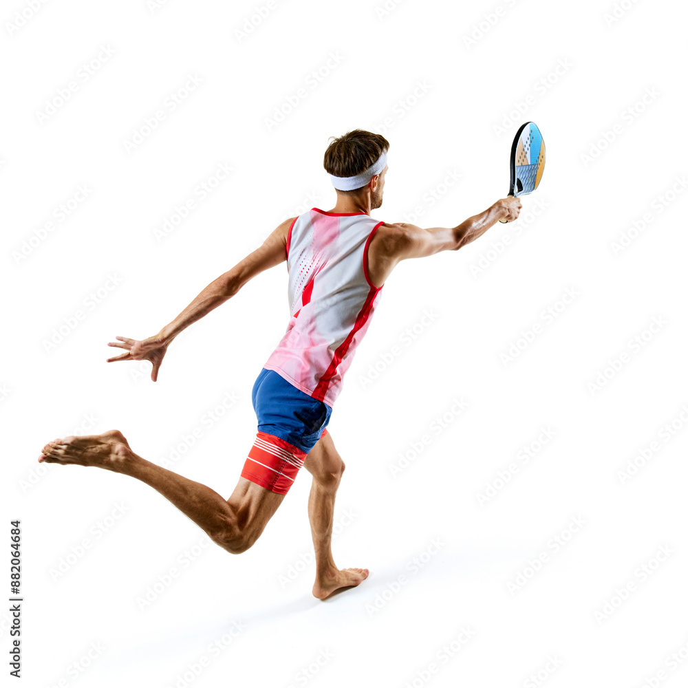 Dynamic image of young man, beach tennis player showing his motivation for victory, playing with intensity, isolated on white background. Concept of sport, active lifestyle, hobby, games, competition