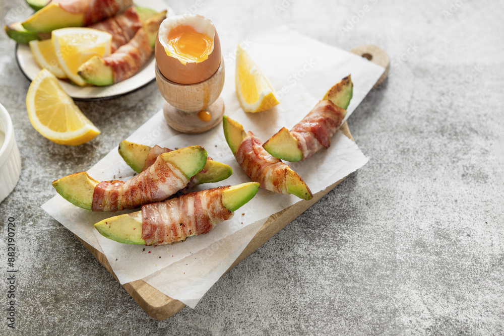 Avocado slices wrapped in bacon served with boiled egg on wooden board, healthy savory breakfast