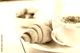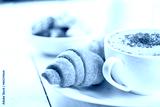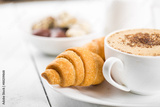 Hot cappuccino and pastries on white wooden boards