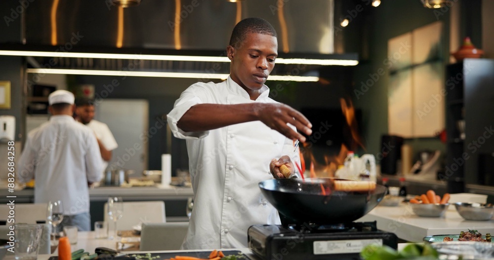 Black man, chef and seasoning with frying pan in kitchen at restaurant for fine dining, meal and creativity. Employee, professional and cook with food for culinary, hospitality and catering service