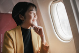 A woman in a yellow jacket is sitting in an airplane window, smiling. She is holding a pen in her hand