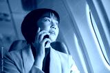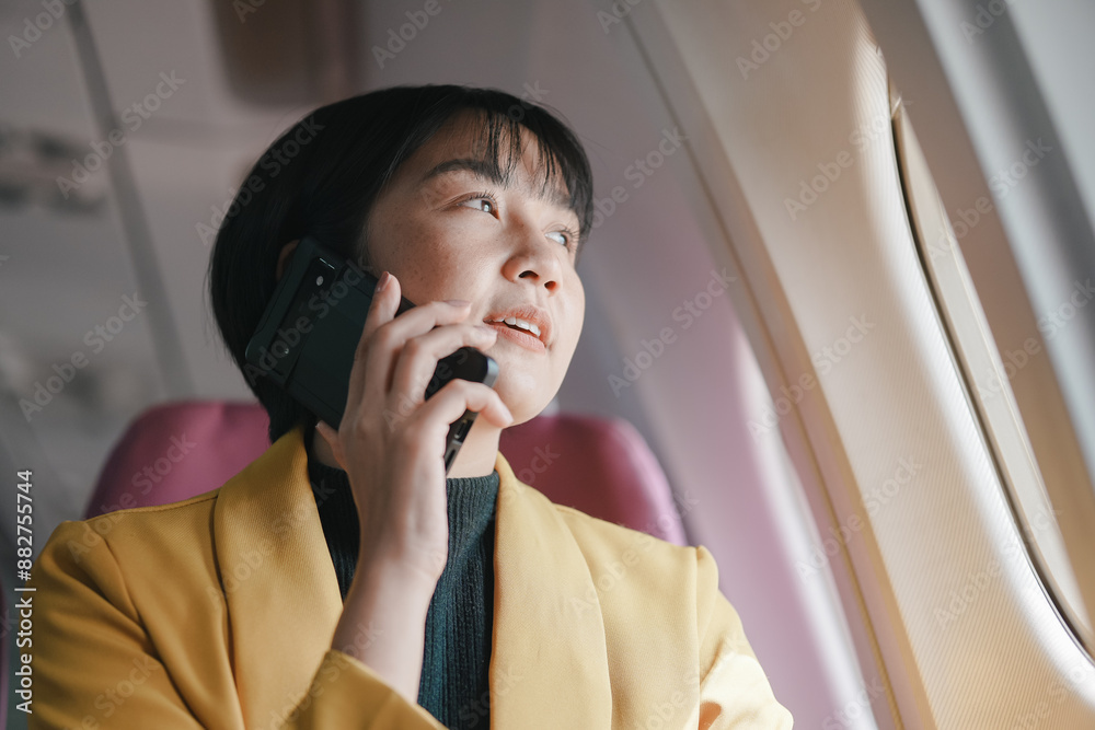 A woman is talking on her cell phone while sitting in an airplane. She is wearing a yellow jacket and she is in a good mood