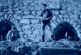 An archaeologist of the last century gives instructions on the work of a mercenary of Arab appearance against the backdrop of a fortress wall and his equipment with a chest. Educational project
