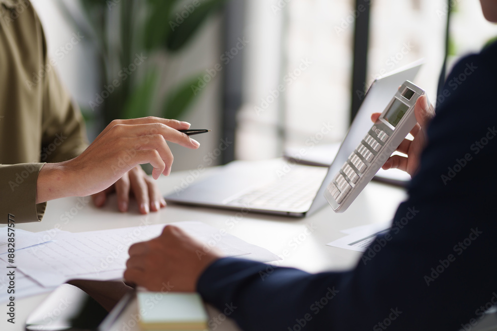 A close-up view of two individuals engaged in a business discussion. One person is pointing with a pen while the other is holding a calculator
