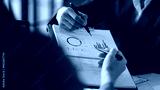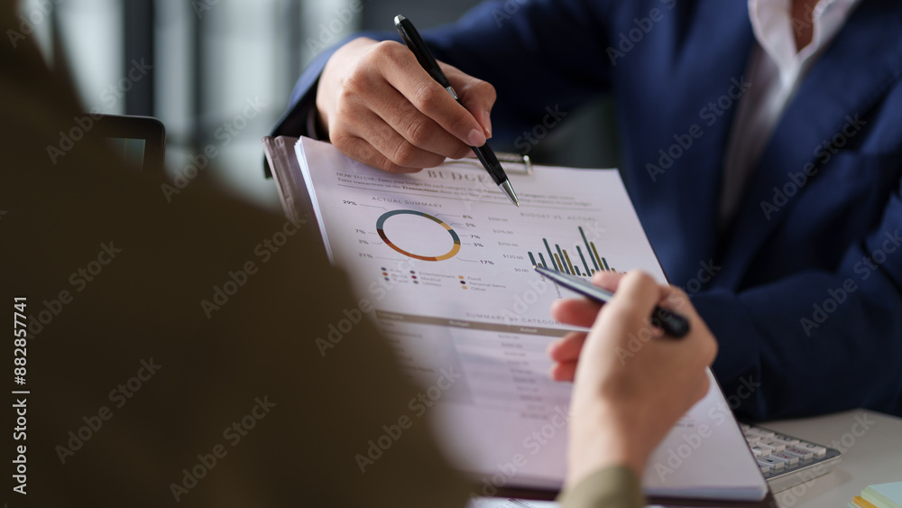 Two individuals are engaged in a business discussion, focusing on a document with graphs and charts. One person is pointing with a pen while the other is holding a clipboard