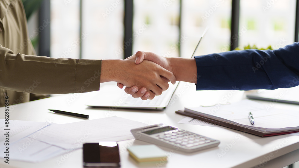 Two individuals are shaking hands across a desk, indicating a successful agreement or partnership. The desk is cluttered with document