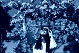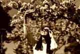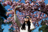 A woman is taking a selfie in front of a tree full of pink flowers. She is wearing sunglasses and a white sweater