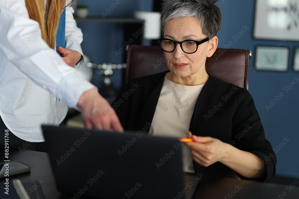 A woman in a business suit is looking at a laptop computer. A man is standing behind her, pointing at the screen