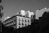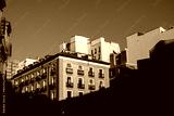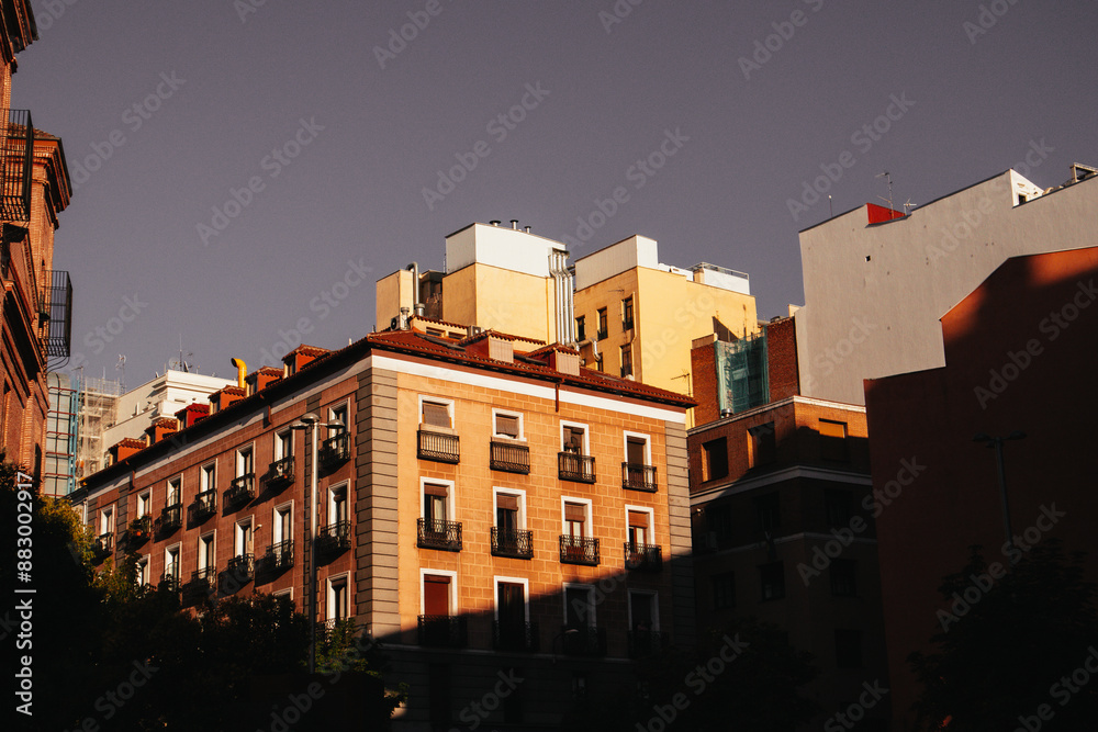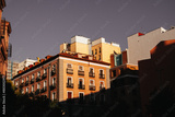 Building facades in different architectural styles against dark blue sunset sky. High-rise buildings in a downtown. Apartment buildings with windows.