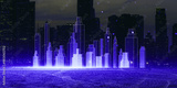 A digital illustration of a city skyline with VR-style buildings on a cyberspace background, conveying a smart city concept. 3D Rendering