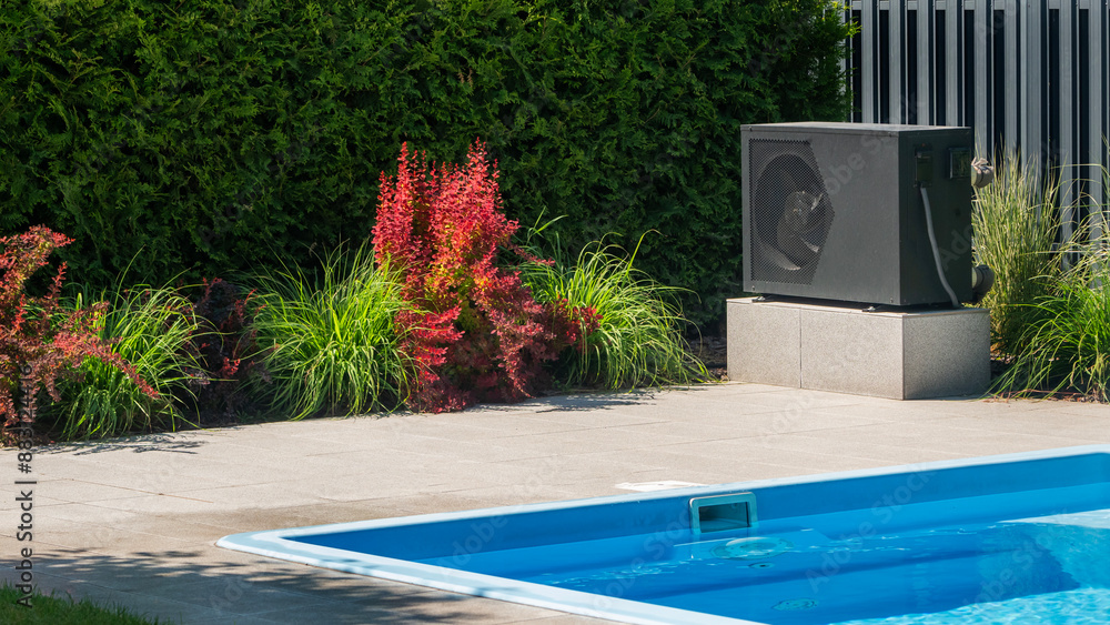 Outdoor heat pump near a swimming pool with surrounding decorative plants.