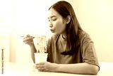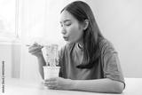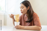 Happy temptation, attractive asian young student woman, cute girl using chopsticks eating instant ramen, noodles soup from a cup, cooking meal fast food lifestyle of traditional japanese person.