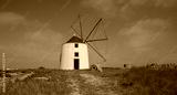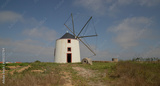 Old restored windmill in Aljezur, Portugal, against the blue sky