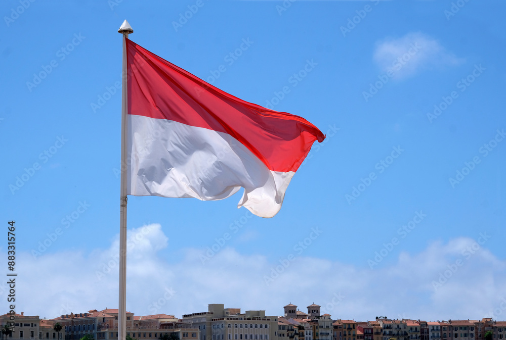 The flag of Monaco waving in the wind in front of a blue sky