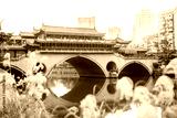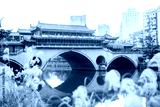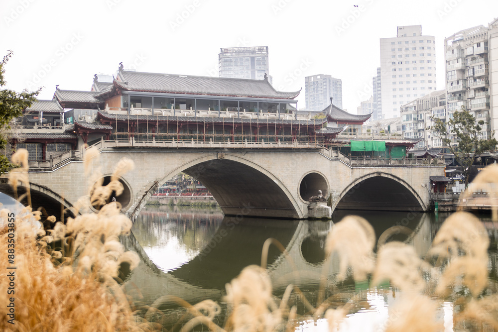 looking through grass towards the Anshun bridge with reflection on the river in downtown chengdu china