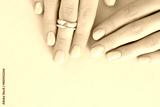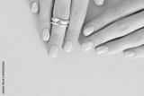 Womans hands with trendy nude manicure on pink background. Summer nail design
