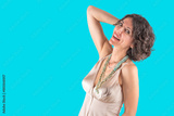 Cheerful woman posing in front of vibrant blue color background. Smiling big and looking to camera.