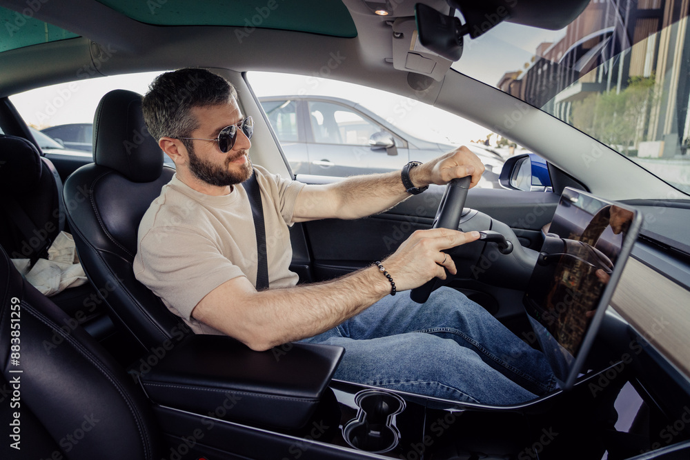 A stylish adult male with sunglasses drives a modern electric car, showcasing technology and eco-friendly transportation in an urban setting.