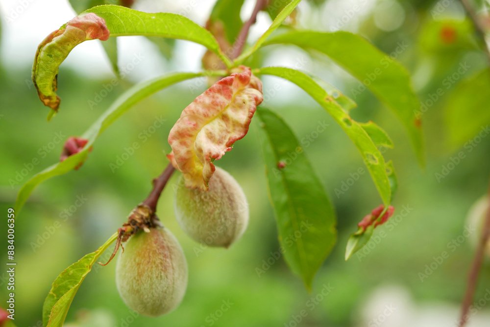 Peach leaf curl sick leaves and fruit on peach tree Taphrina deformans close-up. Fungal disease of peaches tree Prunus persica. Taphrina deformans pest disease farming. Infects detail nectarine Europe