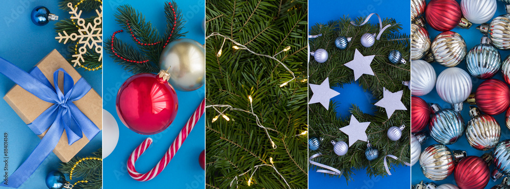 Christmas collage. Christmas decoration on the blue background. Close-up.