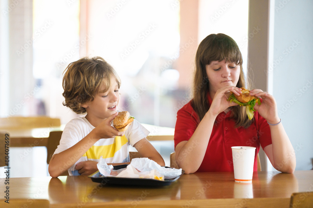 Kids eating fastfood. Unhealthy junk food.