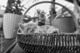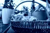 Cute sweet red sleeping kitten in a straw basket on the terrace of a country house