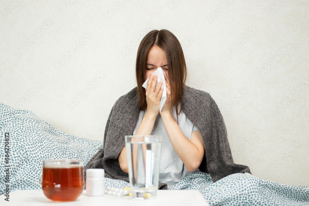 Sick teenager with cold and flu, unwell teen with a temperature, suffering from a disease.