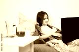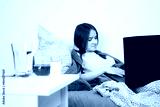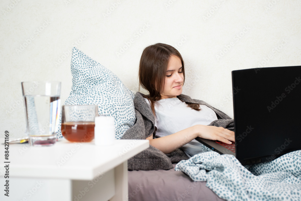 Teenager is sick, lying in bed with a laptop, person battling cold and sneezing, using computer for lessons, online education amid sickness.