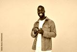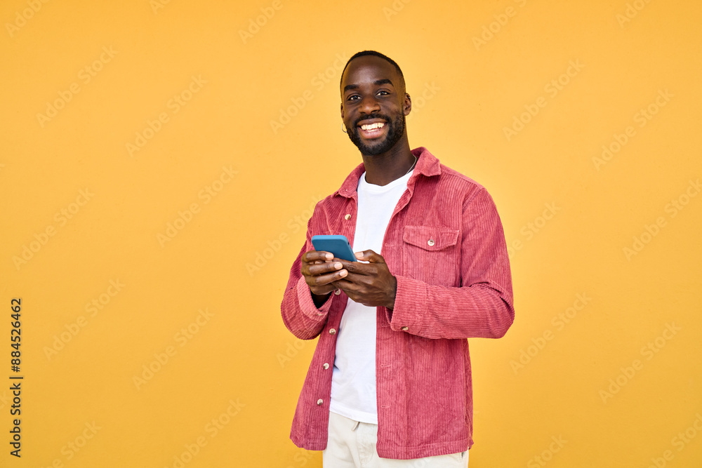 Young happy smiling African American Black hipster man wearing red shirt with cellphone standing isolated on yellow background holding smartphone using mobile cell phone technology looking at camera.