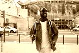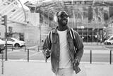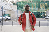 Happy cool stylish young African Black man student hipster wearing headphones, sunglasses and backpack feeling joy having fun listening music and dancing walking on city street outdoors. Candid photo.